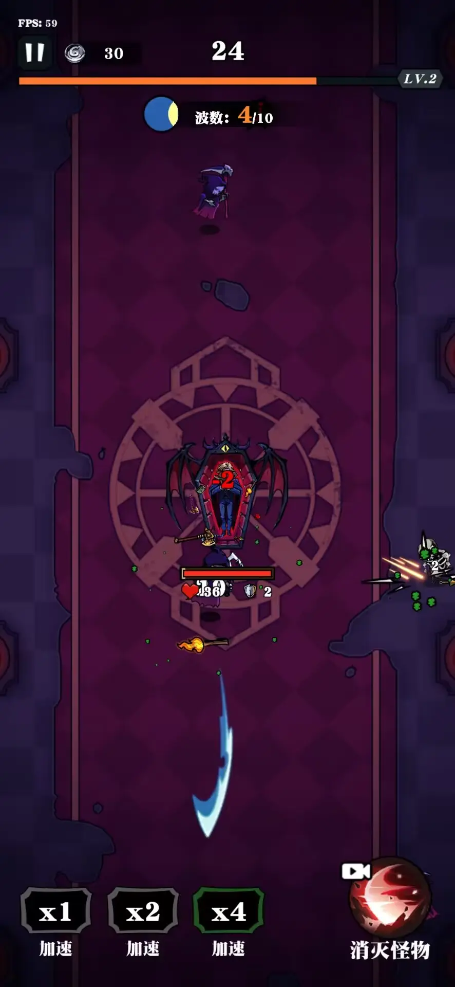 *玩家需要在游戏中控制各种吸血鬼,收集敌人掉落的装备等奖励,获取并升级自己,努力生存 30 分钟。攻击是完全自动的。